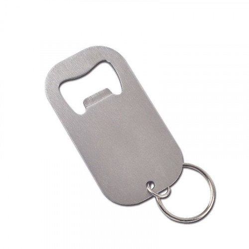Formet som ID Brik / øloplukker i skuret rustfrit stål, bredde 38 millimeter højde 70 millimeter, nøglering på 25 millimeter.