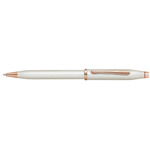 Flot kuglepen i hvid perlelak med polerede rosa guld detaljer.