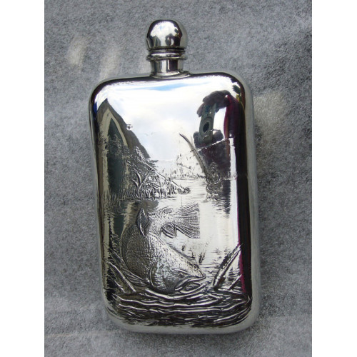 Lommelærke Pewter Engelsk 6 oz. præget lystfisker